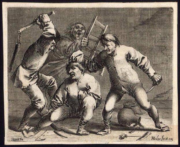 In another work, an engraving, by Pieter Quast, “Fighting Peasants in an Inn” (1630), there is a peculiar scene of desonance where violence is coupled with pleasure. A kneeling figure in the middle is attacked by three deranged peasants in an inn: one is threatening with a knife, another is holding a chair to be smashed on the head on the kneeling man, and a third man is caught in the act of assailing with nun chucks. Despite all the death threats surrounding him – it should also be added that the attacker on the right is portrayed wearing breeches with an unflapped codpiece where an erected penis is carefully hidden – the one about to be destroyed has a rather enchanted, mesmerised, pleased, fascinated and enticing look in his eyes. It is as if his satisfaction will reach a climax if only we the spectators take part in his pleasure of desonance, or join him in this scene of a desonative act, representation of a desonative destruction, as it were.
