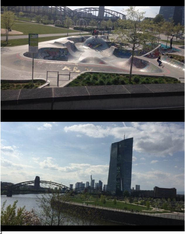 Back in 2012, when the scaffolding of the two ECB towers was already built, the so-called Hafenpark opened its doors to the public. Partially replacing the former shipping area Osthafen, its main attraction until today is Frankfurt´s biggest open air skatepark, which since five years now attracts skaters and BMX bikers alike. Although Hafenpark in its entirety is the result of participatory urban planning – in 2009 more than 1.200 people could vote in an online survey and decide that next to the pipes, ramps, and funboxes for the skaters and bikers there also should be a green section for older or less risk-oriented people as well as a third section of about 3.500 square meters with facilities for all kinds of ball sports –, its proximity to the new ECB towers was decided from above. In short terms: Hafenpark has the aim to represent Frankfurt am Main not only as the city of financial flows but also of the overflow of various activities of people from all ages and social strata of society, especially those who are involved in the art of skating within flexible and demanding infrastructures and interactively designed environments.