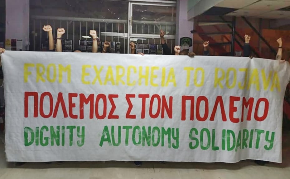 We say: FROM EXARCHEIA TO ROJAVA – WAR TO THE WAR! Unfortunately we can not say: NO to war! This would be just a wish – denying the truth of our existence. For us SOLIDARITY WITH ROJAVA means continuing our struggles where we are everyday! For dignity, autonomy and solidarity! Against any kind of oppression, exploitation, patriarchy, capitalism and authoritarianism – by any means necessary according to collective decisions. Solidarity is the weapon of the people! Rojava will live forever! Keep the fire burning!