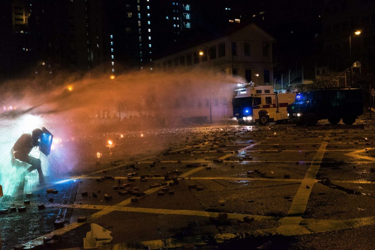 Als die Brücken brannten und den Polizeieinsatz blockierten, vervielfachte ein Wasserwerfer die Angriffe auf der Seite der Kreuzung Chatham Road und Austin Road. Nach dem Scheitern der Eindringlinge von den Brücken und Fußgängerbrücken östlich des Campus konzentrierten sich die Kämpfe auf diese Überquerung. Bis in die frühen Morgenstunden wird das gleiche Ritual in regelmäßigen Abständen wiederholt: Alle 15 Minuten startet der Wasserwerfer mit voller Geschwindigkeit, dazu schreiender Sirenenlärm, in Richtung der etwa hundert „Frontliner“, die sich heftig wehren. Sie klammern sich an ihre Schirme und improvisierten Schilde und gegen die Wasserfluten, gemischt mit der gefürchteten blauen Pfefferlösung, die zum Markenzeichen der Hongkonger Bereitschaftspolizei geworden ist.